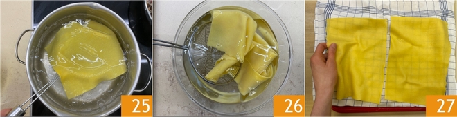 Escaldad las láminas en agua salada durante un minuto 25, luego escurridlas en agua fría para detener la cocción 26 y colocadlas sobre un paño para secar 27.