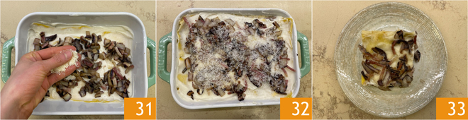 Añadid la mezcla de achicoria y speck, luego espolvoread con Parmigiano Reggiano rallado 31. Continuad alternando las capas de esta manera hasta agotar los ingredientes, terminando con una capa de bechamel, achicoria y queso rallado. Cocinad en horno estático precalentado a 180° durante unos 30-35 minutos 32. Cuando esté dorada en la superficie, sacad del horno y dejad reposar unos minutos. ¡Vuestras lasañas de achicoria están listas para ser servidas 33!