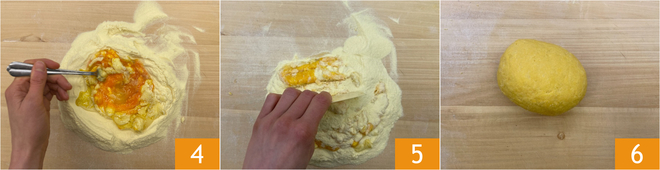 Comenzad a mezclar los ingredientes con un tenedor, incorporando gradualmente la harina 4, luego continuad a mano ayudándoos con un rasqueta 5. Cuando hayáis obtenido un panecillo liso y homogéneo 6, envolvedlo en film y dejad reposar a temperatura ambiente durante unos 30 minutos.