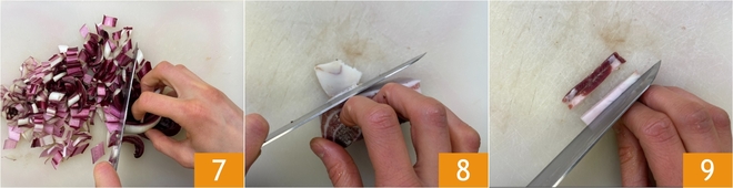 Mientras tanto, dedicad al relleno: lavad la achicoria y cortadla en tiras 7. Retirad la corteza del speck 8 y cortadlo en tiras 9.