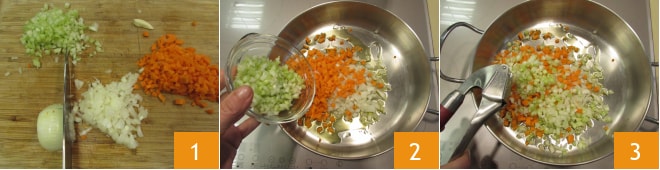 Para realizar la lasaña de col primero empezad a preparar el ragú. Picad finamente con un cuchillo el apio, la zanahoria pelada y despuntada y la cebolla limpia 1. Verted el aceite en una cazuela y añadid el picado para el sofrito 2 y el ajo machacado 3. Sofreíd durante unos diez minutos a fuego lento, removiendo de vez en cuando.