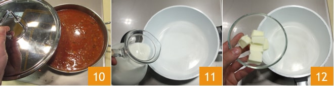 Añadid una pizca de sal, mezclad, cubrid con la tapa 10 y dejad cocer a fuego medio durante 10 minutos, luego bajad la llama a bajo y proseguid la cocción durante 2 horas. Mientras tanto, ocupáos de la bechamel. Calentad en un cazo la leche 11, aparte derretid los 100 g de mantequilla a fuego bajo 12.