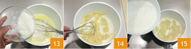 Apagad el fuego y añadid los 100 g de harina 13 a la mantequilla derretida, removiendo con una varilla para evitar la formación de grumos 14. Luego volved a ponerlo a fuego lento y mezclad hasta que se vuelva dorado. Aromatizad la leche con la nuez moscada y una pizca de sal y verted un poco de leche caliente sobre el compuesto para diluir el fondo, luego agregad el resto 15, mezclad enérgicamente todo con la varilla. Cocinad 5-6 minutos a fuego lento hasta que la salsa se haya espesado y comience a hervir.