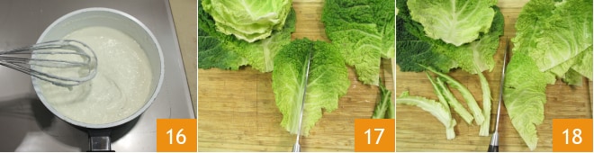 Reservad la bechamel 16. Ahora ocupáos de la col. Deshojad la col obteniendo 16 hojas. Eliminad el tronco interno 17 obteniendo dos hojas menos curvas 18.