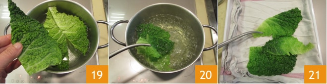 Escaldadlas poco a poco en agua hirviendo con sal 19. Dependiendo del grosor de las hojas, cambia el tiempo de cocción, de 5 a 10 minutos. Apenas estén blandas escurridlas 20 y transferidlas a una bandeja forrada con un paño de cocina y dejadlas secar 21.
