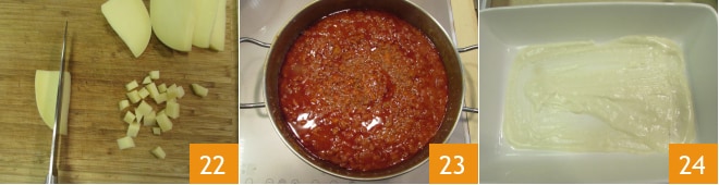 Cortad la provola en cubitos 22. Mientras tanto el ragú también estará listo 23 y podréis componer la lasaña. Tomad una fuente rectangular de 20x30 cm, verted en el fondo una capa de bechamel 24.