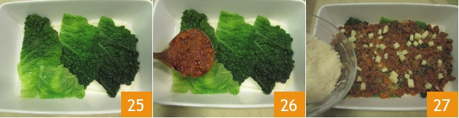 Colocad 4 hojas de col 25, distribuid encima el ragú 26 y completad con la provola y el queso rallado 27.