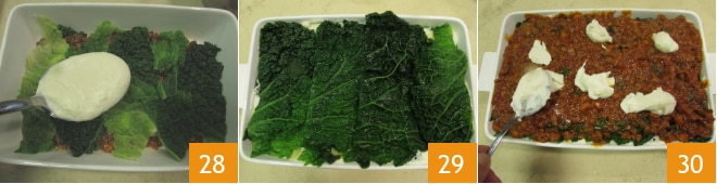 Proseguid con otra capa de coles, luego la bechamel 28, el ragú y los quesos. Continuad de este modo hasta agotar los ingredientes, deberíais obtener 4 capas. Para la última capa distribuid la col 29, el ragú, la bechamel 30.