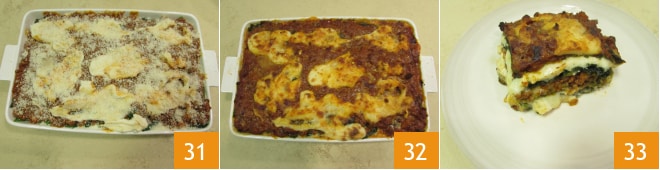 y espolvoread solo con el queso rallado 31. Coced en horno estático ya caliente a 200°C durante 30 minutos y luego continuad 5 minutos con el grill. Sacad del horno la lasaña de col 32, dejadla templar antes de servirla 33.