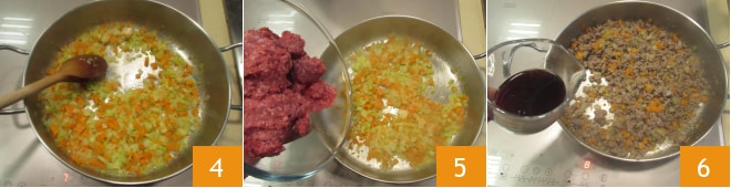 Cuando el sofrito esté bien dorado 4, agregad la carne de res molida 5. Dorad lentamente durante unos diez minutos, removiendo de vez en cuando. Desglasad con el vino tinto 6.