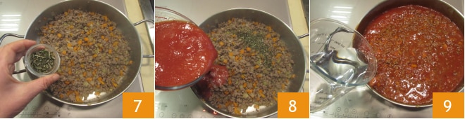 Tan pronto como el alcohol se haya evaporado, sazonad con el romero 7, verted el puré de tomate 8 y el agua 9.