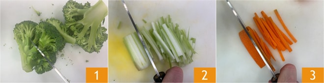 Para preparar las lasañas de crepe con verduras, como primer paso, cortad los floretes en trozos 1; luego cortad el apio y la zanahoria, previamente limpiados, en tiras 23.