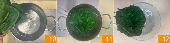 Mientras tanto, sumergid las espinacas en agua hirviendo con sal 10, blanqueadlas durante solo 2-3 minutos y escurridlas con una espumadera 11, luego transferidlas a un bol con agua y hielo 12; de este modo detendréis la cocción y preservaréis el color de las espinacas.