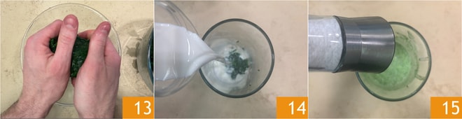Escurrid bien las espinacas 13 y transferidlas a una batidora; verted la leche 14, ajustad de sal 15 y batid hasta obtener una salsa lisa y homogénea.