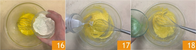 En un bol batid los huevos, añadid la harina 16 y mezclad hasta obtener una masa lisa y homogénea, añadid poco a poco la leche 17 y finalmente la crema de espinacas 18.
