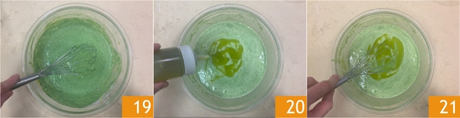 Mezclad para amalgamar bien todos los ingredientes y obtener una masa homogénea 19, luego añadid un chorrito de aceite 20 y mezclad nuevamente 21.