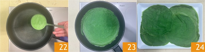 Engrasad una sartén, calentadla y verted dentro un cucharón de masa 22, cuando esté cocida la crepe 23, por ambos lados, colocadla a enfriar en un plato 24. Con estas cantidades deberíais obtener 10 crepes.