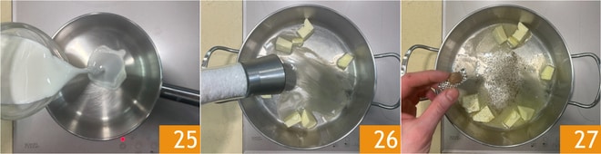 Mientras tanto, preparad la bechamel. Poned a calentar en un cazo la leche 25. En una cacerola derretid la mantequilla, añadid la sal 26, la pimienta y la nuez moscada 27.