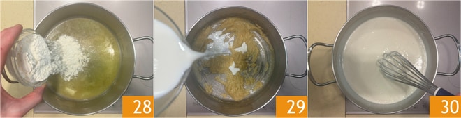 Añadid la harina 28 y coced durante 2 minutos, removiendo continuamente. Verted la leche caliente en la cacerola 29 y coced, removiendo de vez en cuando, hasta que la bechamel se haya espesado 30.