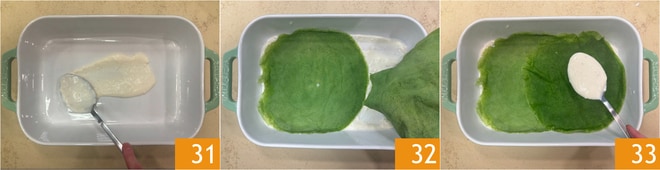 Ha llegado el momento de montar la lasaña. En el fondo de una fuente para horno poned un par de cucharadas de bechamel 21, colocad encima dos crepes de espinacas 32 y continuad con otra capa de bechamel 33.