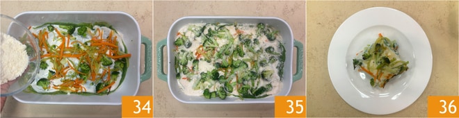 Sobre la bechamel poned abundantes verduras, luego añadid una pizca de parmesano 34. Continuad así hasta terminar los ingredientes. Espolvoread la superficie de las lasañas con el parmesano 35. Coced en el horno ventilado a 180°C durante 20 minutos. Si queréis que en la superficie se cree una deliciosa costra, moved la fuente a la parte alta del horno y coced en modo grill durante otros dos minutos, cuidando de no quemarlas. Sacadlas del horno y dejadlas reposar durante 5 minutos. Las lasañas de crepes con verduras están listas, solo os queda emplatar y servir 36.
