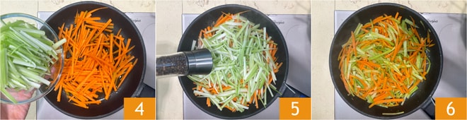 En una sartén verted un chorrito de aceite, poned las zanahorias 4, añadid el apio 4 y ajustad de sal y pimienta 5. Saltead a fuego alto durante 5 minutos 6.