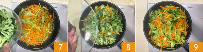 Añadid los brócolis 7, cubrid con una tapa 8, bajad el fuego, y coced durante 15 minutos 9. Si es necesario, añadid un poco de agua.
