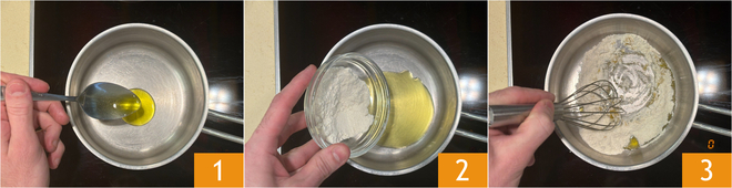 Para preparar las lasañas de gambas y pistachos, comienza con la bechamel de aceite: en una cacerola calienta el aceite 1, luego añade la harina 2. Remueve y forma el roux, dejando dorar por 1-2 minutos 3.