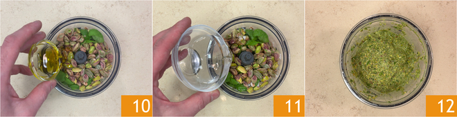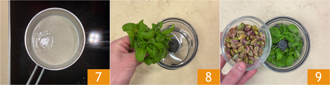 Una vez lista, cubre la bechamel con film en contacto y reserva. Ocúpate del pesto de pistachos 7: en la batidora pon las hojas de albahaca limpias 8 y los pistachos 9.
