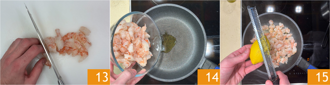 En este punto, dedícate a las gambas: pícalas groseramente con el cuchillo 13, luego saltéalas en la sartén con un poco de aceite por unos instantes 14. Aromatiza con la ralladura de limón 15.