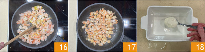 Mezcla para sazonar 16 y apaga el fuego en cuanto las gambas hayan cambiado de color 17. Estás listo para montar las lasañas: en el fondo de una fuente de 20x16 cm distribuye un poco de bechamel 18.