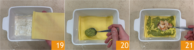 Coloca la primera hoja de pasta 19, luego unta un poco de pesto de pistachos 20 y añade las gambas 21.