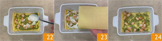 Espolvorea un poco de bechamel 22, luego continúa con otra hoja de pasta 23, pesto de pistachos, gambas 24 y bechamel. Continúa de esta manera hasta agotar los ingredientes 24.