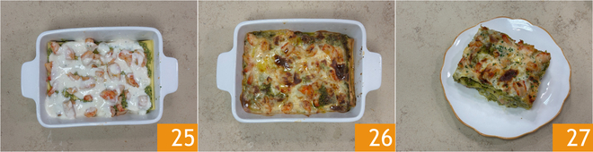 Termina con una capa de bechamel 25 y cocina a 180° por unos 20 minutos, luego continúa la cocción por 5 minutos en modo grill a 230° para dorar la superficie 26. ¡Tus lasañas de gambas y pistachos están listas para ser servidas 27!