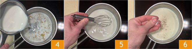 En este punto, vierte la leche caliente 4 y sigue removiendo con la varilla en el fuego hasta que la salsa espese 5. Sazona con nuez moscada y sal 6.