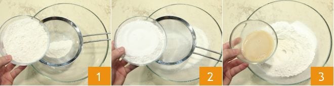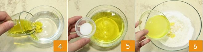 Vierte el aceite en el agua tibia restante 4, añade la sal 5 y mezcla, después agrega el líquido obtenido sobre la harina 6 en forma de hilo.