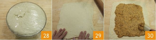 Toma la masa de pan, que habrá duplicado su volumen 28, transfiérela a una superficie de trabajo ligeramente enharinada y extiéndela con un rodillo, tratando de obtener un rectángulo de masa de aproximadamente 50x40 cm 29. Deja 5 cm de borde y distribuye la mezcla de ragú y bechamel con el dorso de una cuchara 30.
