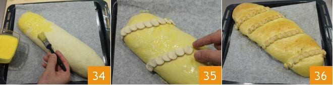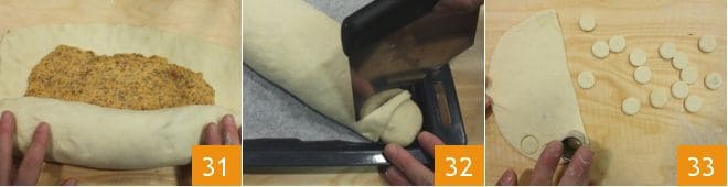 Enrolla la masa 31 y transfiérela a una bandeja de horno forrada con papel pergamino. Corta los extremos con un cortapastas y dóblalos para que el relleno no se salga durante la cocción 32. Deja que leude nuevamente el strudel crudo en horno apagado con la luz encendida durante 1 hora. Extiende la masa sobrante y corta pequeños círculos con un cortapastas pequeño de unos 2 cm de diámetro 33.