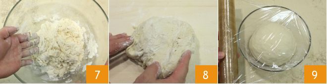 Comienza a mezclar la mezcla en el bol para recoger bien los ingredientes 7, luego continúa trabajando la mezcla a mano sobre una superficie de trabajo 8 durante unos diez minutos, hasta que esté lisa y elástica. Dale forma de bola, transfiérela a un bol, cubre con film transparente 9 y deja que leude en horno apagado con la luz encendida durante unas 2 horas.