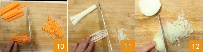 Mientras tanto, dedícate a la preparación del sofrito que será la base de tu ragú: pela una zanahoria con un pelador de verduras, córtala primero en tiras y luego en cubos bastante pequeños 10. Continúa pelando medio tallo de apio y redúcelo a cubos 11, finalmente pela una cebolla, córtala por la mitad y luego en dados 12.