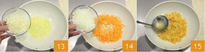 Calienta un chorrito de aceite y la mantequilla en una sartén antiadherente, luego agrega el picado de cebolla, apio y zanahoria (13-14). Deja que se sofría hasta que las verduras estén doradas, y rocía con un cazo de caldo vegetal 15. Para descubrir cómo prepararlo mejor, consulta nuestra Escuela de cocina Caldo vegetal.
