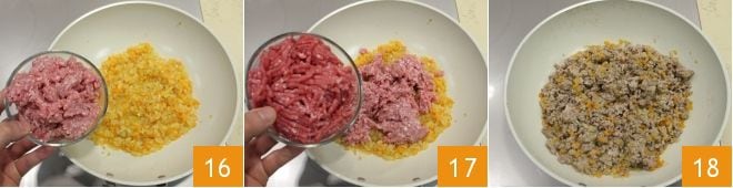 Añade el picado de carne de cerdo 16 y el picado de carne de res 17, deja cocinar a fuego medio hasta que la carne esté bien dorada 18, si es necesario puedes rociar con algunos cazos de caldo vegetal.