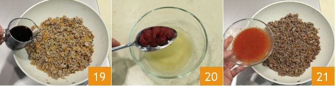 Rocía con el vino tinto 19, disuelve el concentrado de tomate en un poco de caldo 20 y agrégalo al ragú en cocción 21. Continúa cocinando el ragú durante unos treinta minutos, hasta que haya absorbido todos los líquidos.