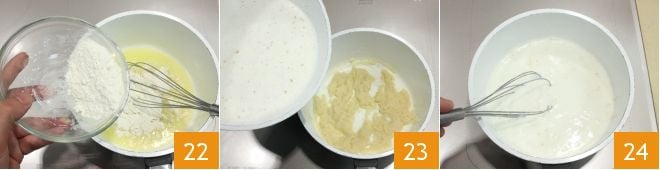 Mientras el ragú se cocina, prepara la bechamel: derrite la mantequilla en un cazo y añade la harina 22, cocina todo durante unos minutos, mezclando para evitar que se pegue. Una vez obtenido el roux, vierte la leche caliente 23 y mezcla con una cuchara de madera. Deja cocinar hasta que empiece a hervir, luego añade un poco de sal y nuez moscada, cubre con una tapa y cocina a fuego bajo durante unos 10 minutos, hasta que la bechamel esté espesa 24.