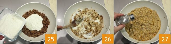 Una vez preparada la bechamel, únela al ragú 25 y mezcla para amalgamar todo 26, sala y pimienta al gusto 27.