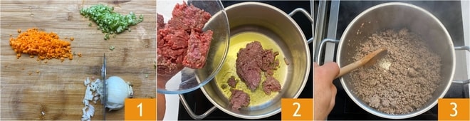 Para realizar las lasañas sin bechamel, primero preparad el ragú: limpiad y picad finamente el apio, la zanahoria y la cebolla 1. En una cacerola calentad un poco de aceite, luego añadid la carne picada de ternera y de cerdo 2 y dorad a fuego alto hasta que el fondo esté seco 3.