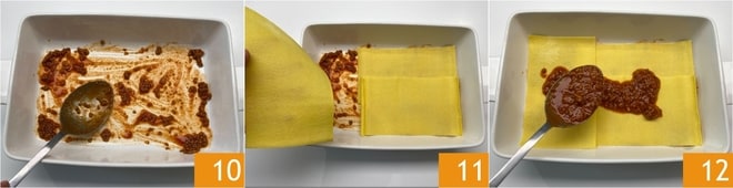 Pasado el tiempo de cocción del ragú, podéis montar vuestras lasañas: tomad una bandeja de 20x30 cm y distribuid una capa de ragú en el fondo 10, luego colocad 3 hojas de lasaña 11 y cubrid con el ragú 12.