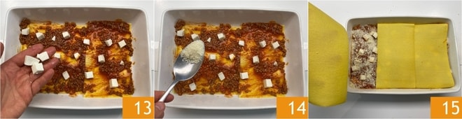 Distribuid algunos cubos de mozzarella 13 y Parmigiano Reggiano DOP rallado 14, luego formad otra capa de lasañas 15 y proceded alternando los ingredientes en este orden hasta obtener 4 capas en total.