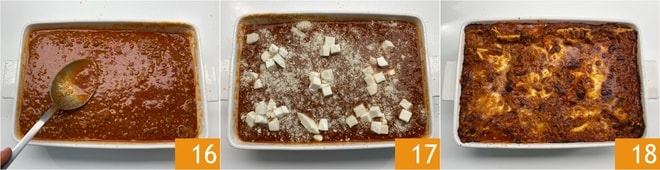Terminad con una abundante capa de ragú 16, mozzarella y queso rallado 17. Cocinad en un horno estático precalentado a 200° durante unos 20 minutos, luego activad el grill y continuad la cocción por otros 10 minutos. Sacad del horno y dejad reposar unos minutos antes de servir vuestras lasañas sin bechamel 18.