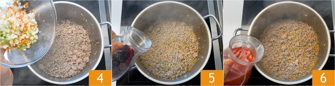 En este punto, bajad el fuego y añadid la mezcla de verduras 4. Dejad que el sofrito se ablande durante unos minutos, luego aumentad nuevamente el fuego y desglasad con el vino tinto 5. Cuando el alcohol se haya evaporado por completo, verted también el puré de tomate 6.